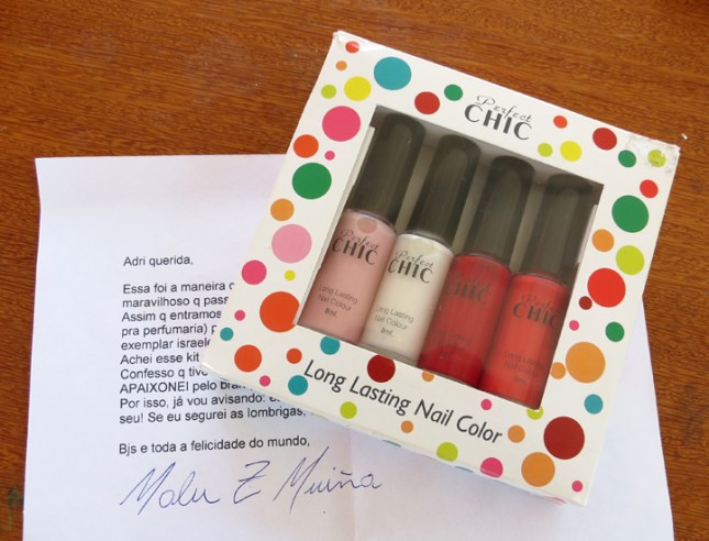 E na BF de hoje, gostaria de agradecer a minha linda e querida amiga Malu por ter carinhosamente se lembrado de mim e me enviado este kit super gracinha de esmaltes que ela trouxe de Israel, onde passou dois meses fazendo testes para uma pesquisa médica para a qual ela se voluntariou.