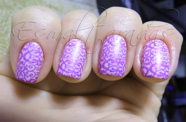 Vocês podem observar que tem um brilho bem bacana. E abaixo, ele fosquinho, pronto para a carimbada, com o mesmo esmalte e desenho da mani anterior.