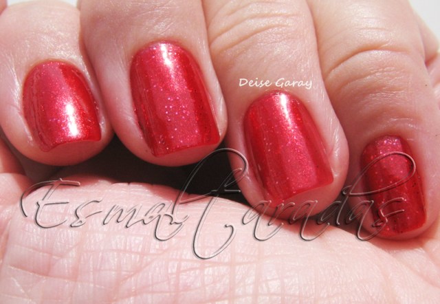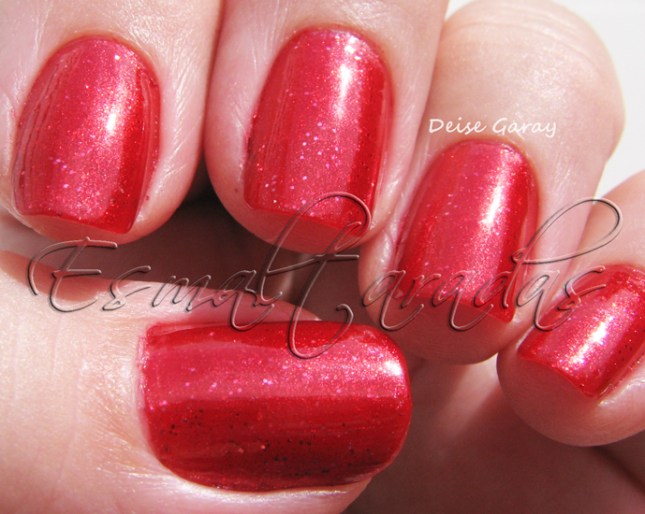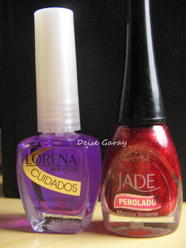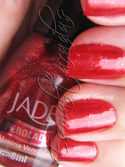 Mas, como eu ia dizendo, o Menina Veneno é um esmalte lindo, mas não é perolado como está escrito no rótulo. Ele tem base jelly vermelha com glitters minúsculos vermelhos e prateados. Vi alguém falar que ele “tenta ser dupe do Ruby Pumps do China Glaze”, mas infelizmente não posso confirmar, porque não tenho o Ruby…buááááá