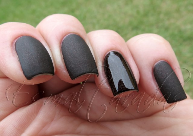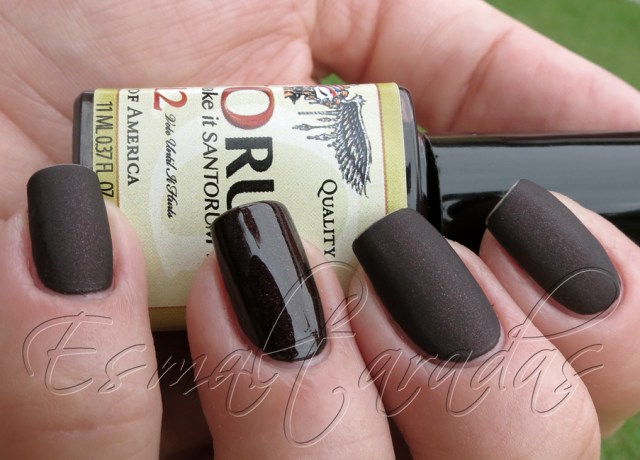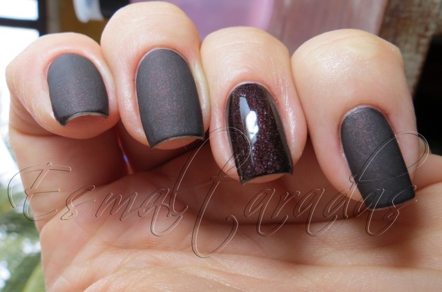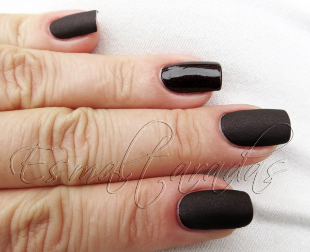 Eu passei (de teimosa que sou) duas camadas do esmalte nessa mani. Mas o esmalte é tão fosco que na unha do polegar fez um canyon, uma “valinha”, como acontece com esmaltes craquelados. Então o lance é uma camada só e PONTO!