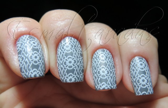 Adorei o resultado, principalmente porque nessa foto o esmalte ficou CINZA, como ele é de fato! A carimbada com esmalte Blant para carimbo ficou parecendo uma renda sobre o esmalte. Pensei até em preencher os miolinhos das flores, mas achei que iria estragar tudo e desisti. Acho que fiz bem, hehehehe.