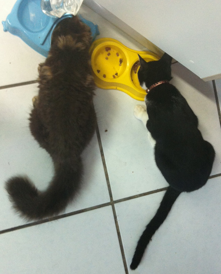 E aqui ele ao lado do Jack comendo. Vejam o tamanho do bichano! Ele está com pouco mais de 4 meses, e o Jack já tem 6 meses, hehehe. Dá pra ter uma ideiazinha do tamanho que ele vai ficar, né? Tudo bem que o “volume” fica por conta do pelo, que é fofo e o faz parecer maior mais gordo. Mas esqueçam o volume e se concentrem somente no comprimento dele (do focinho à derrière).