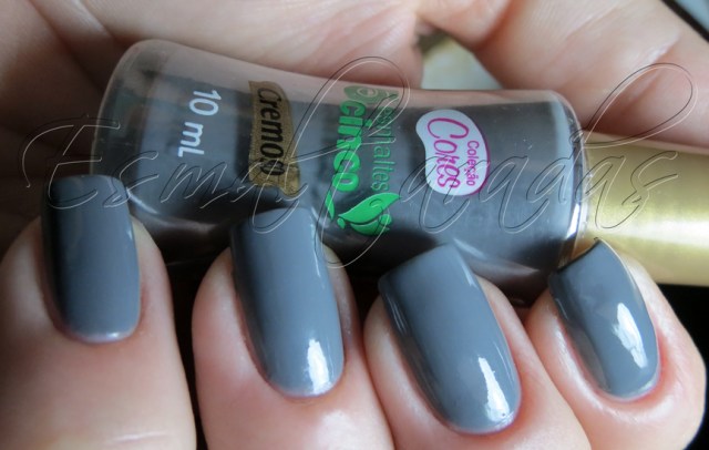 Eu acho esmalte cinza muito chique e sóbrio. Tenho alguns, acho bonito, mas não sei por qual motivo é a cor que mais tenho dificuldade de usar!!! E sério, não é por achar que não combina comigo ou que a cor é feia, eu realmente não sei porque me dá tanta preguiça de usar esmalte cinza.